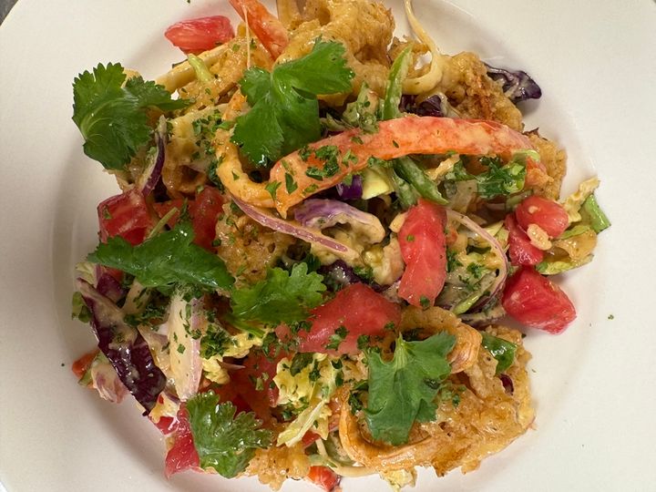 Asian style slaw, sweet peppers, spicy chili vinaigrette, tossed with fried calamari