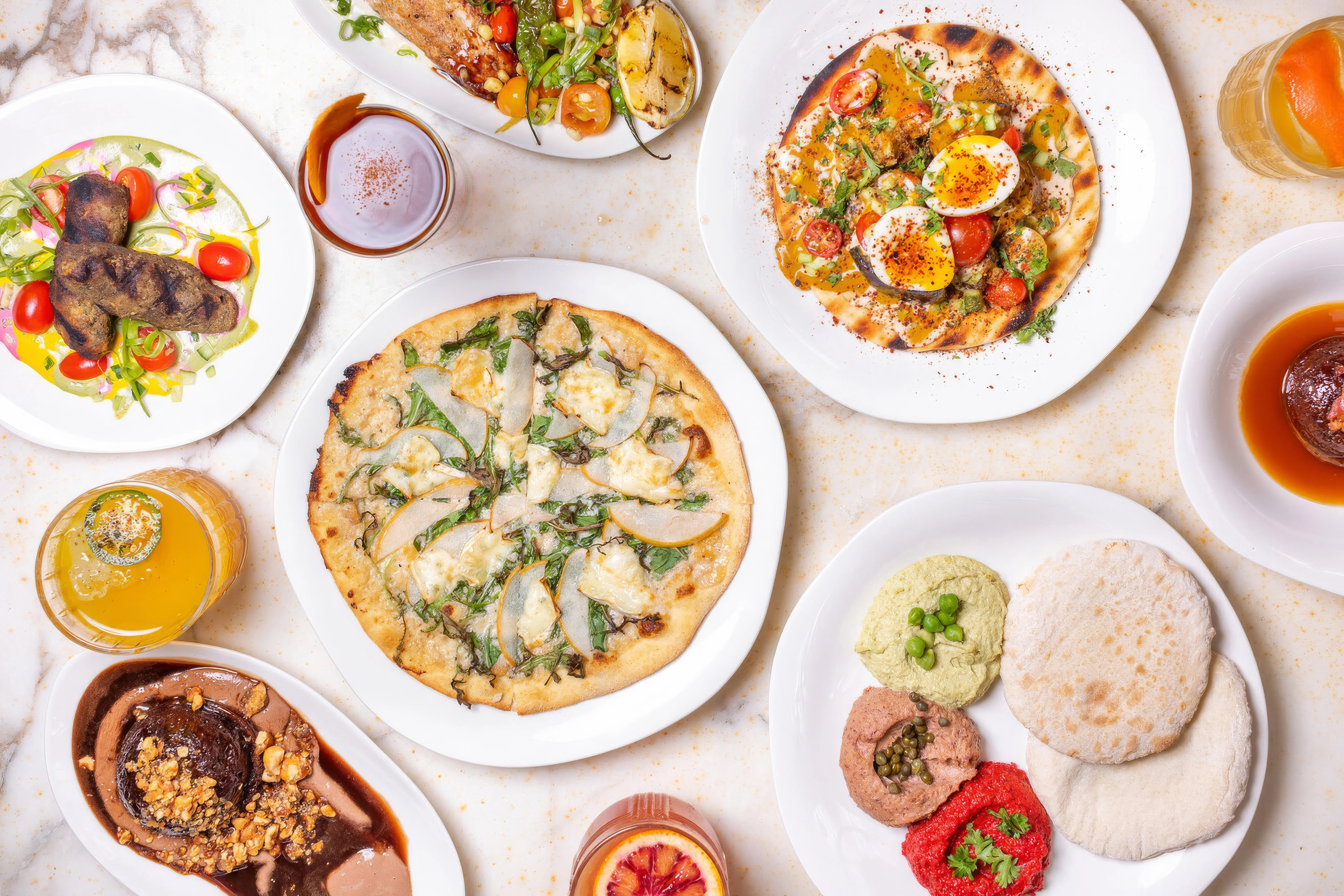 harissa tahini, roasted garlic oil, chili flake, candied almond