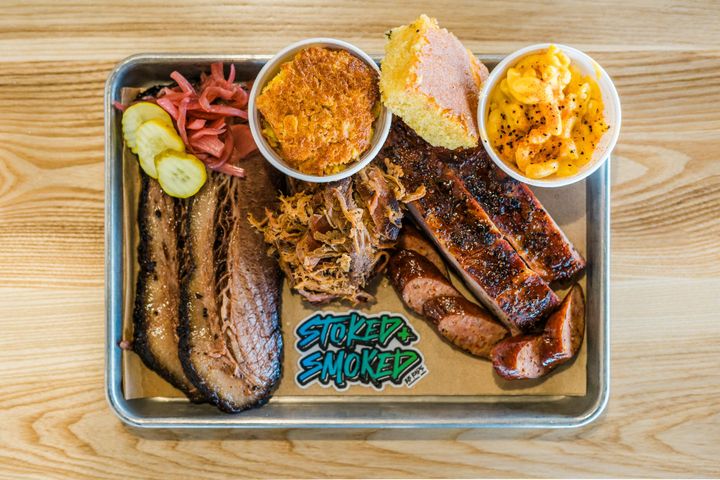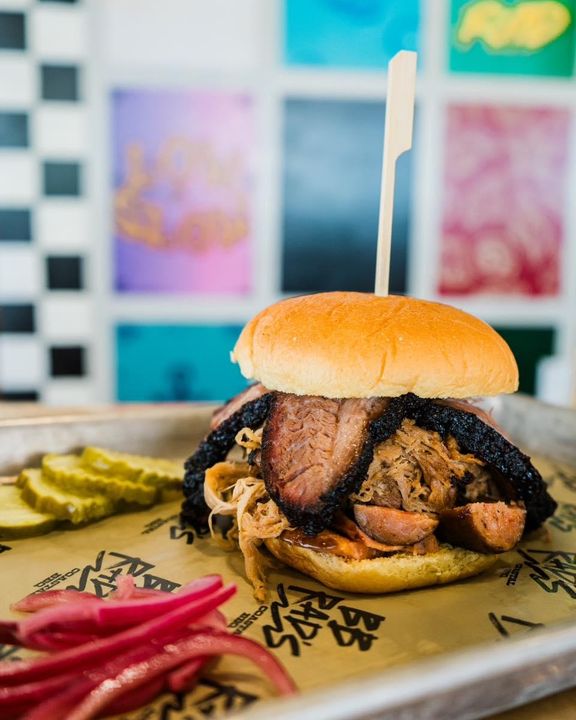 3 meats! A quarter pound each of our favorite brisket, pulled pork, & sausage, all on a bun.