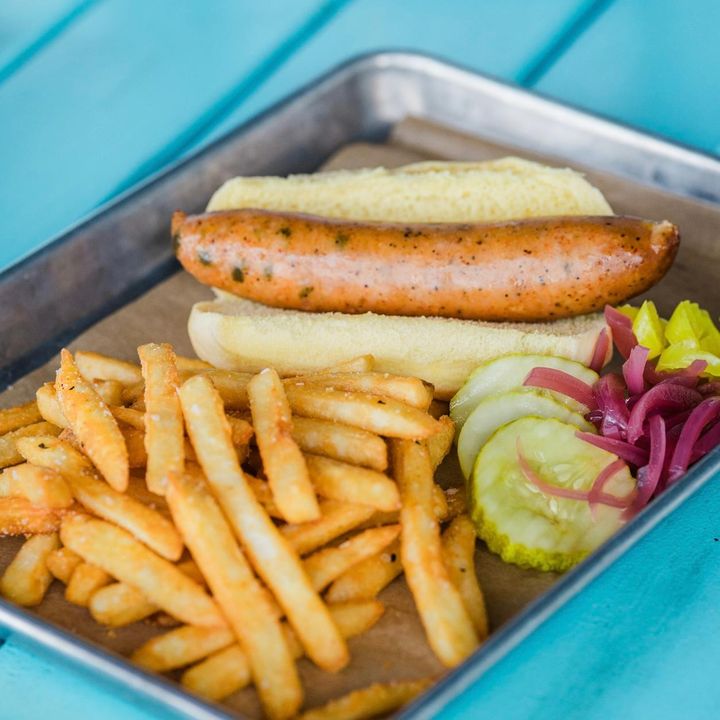 Smoked sausage on our Martin's hotdog bun topped with coastal slaw and served with one side.