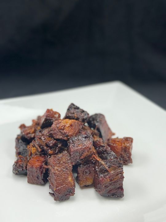Our famous burnt ends on a 4 inch Martin's potato bun.