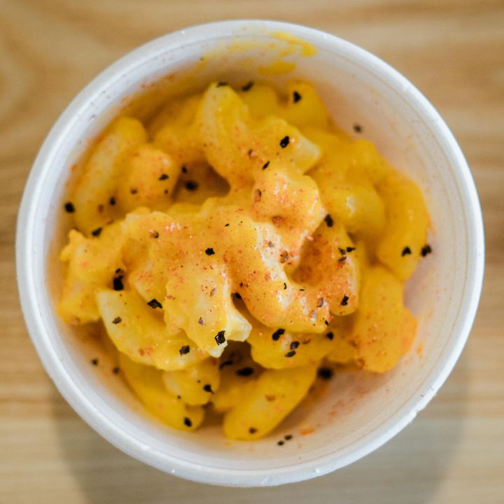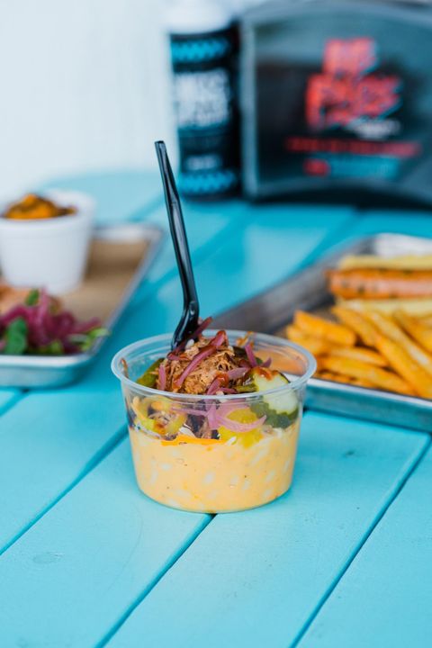 The Deep End Bowl started with mac & cheese topped with our pulled pork. You can add pickles, red onions, or banana peppers by request.
