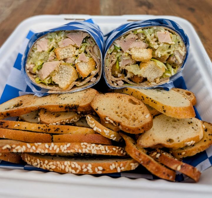 A classic wrap with romaine, shredded parmesan, croutons, and creamy Caesar dressing. Option to add chicken. Served with a pickle spear and a side of bagel chips.