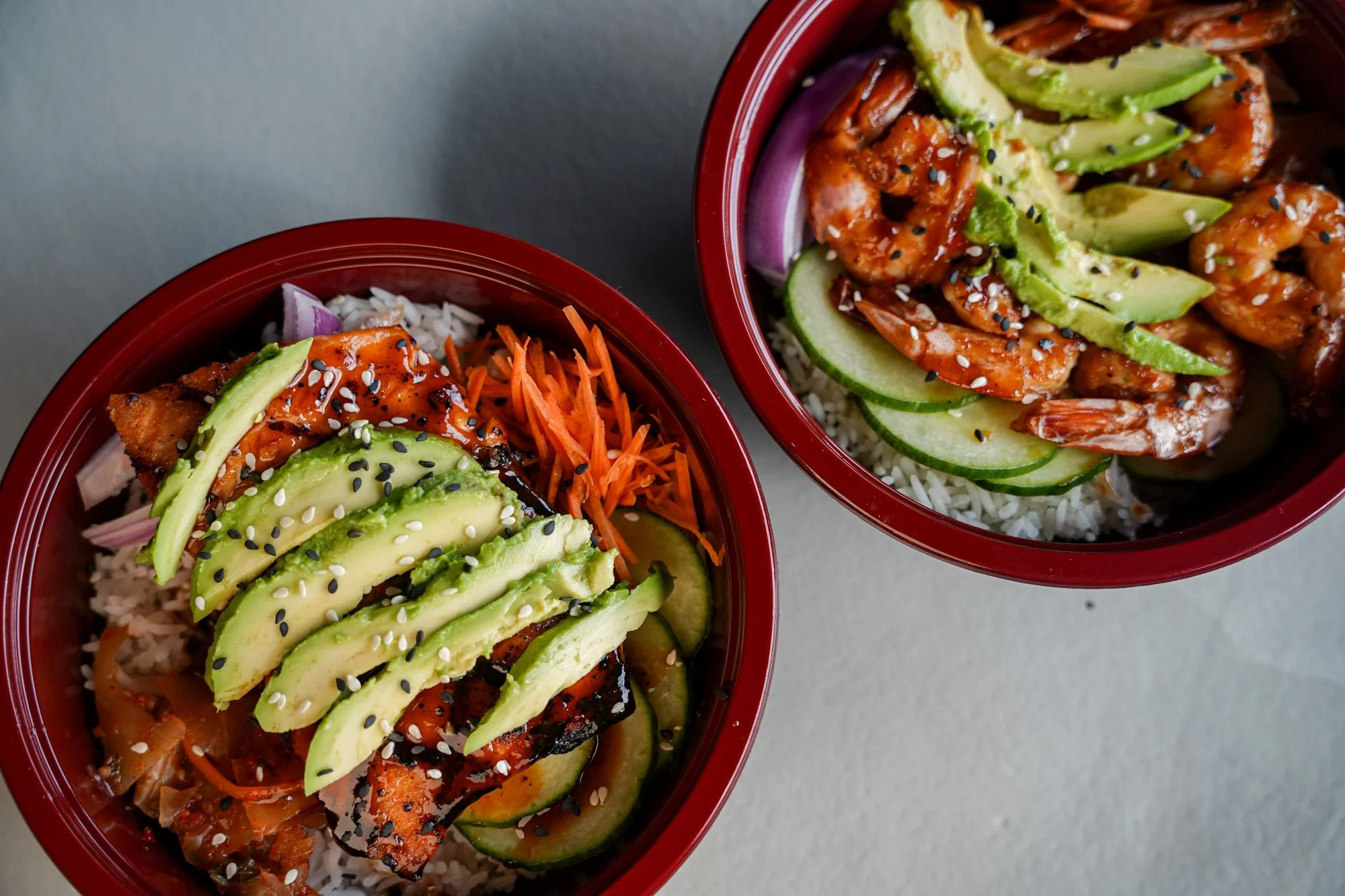 Jasmine rice, sliced cucumber, pickled Asian vegetables, kimchi, teriyaki glaze, toasted sesame seeds