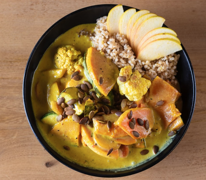 -V, GF- Julia’s signature curry with roasted rainbow carrots, kabocha squash, yams, butternut squash, cauliflower, zucchini, and brown rice. Finished with fresh fruit. *Lions Mane recommended.*