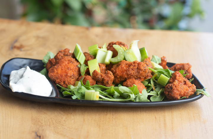 - V, GF - Hand-breaded cauliflower florets tossed in buffalo sauce served with aioli.