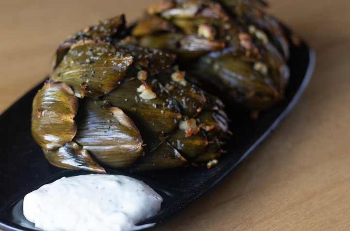 -V, GF- Roasted globe artichoke served with a vegan garlic and lemon aioli.