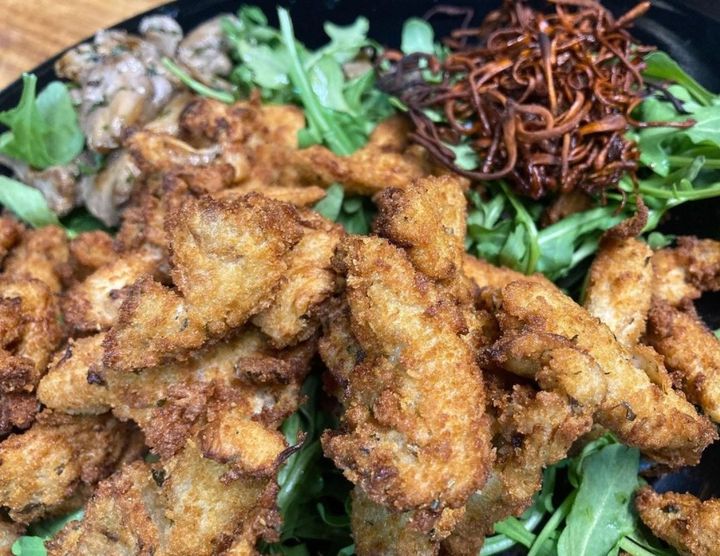 - V, GF - Fried baby blue oysters with cordyceps and Lions Mane.