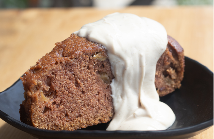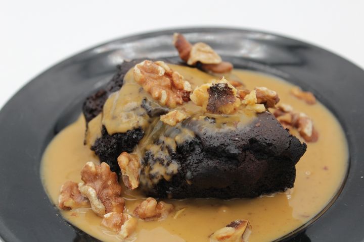 - V GF, Contains Nuts- Rich and moist with walnuts and triple chocolate. Served with our house made wild mushroom infused vegan coconut caramel.