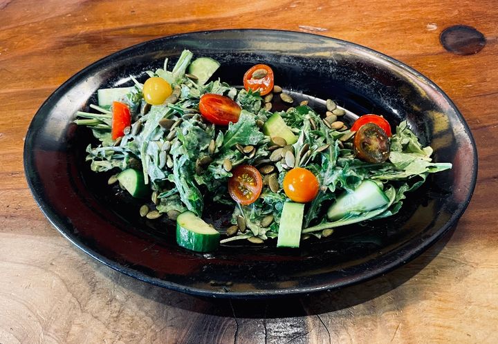 -V GF- Arugula with cherry tomatoes, cucumbers, pepitas, and a creamy tahini dressing.