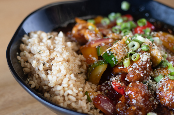 -V- Breaded cauliflower florets, bell peppers, onions, zucchini, and mushrooms - Shiitake, Oyster, and Crimini -, tossed in a sweet spicy orange glaze served over brown rice. *Matsutake recommended.*