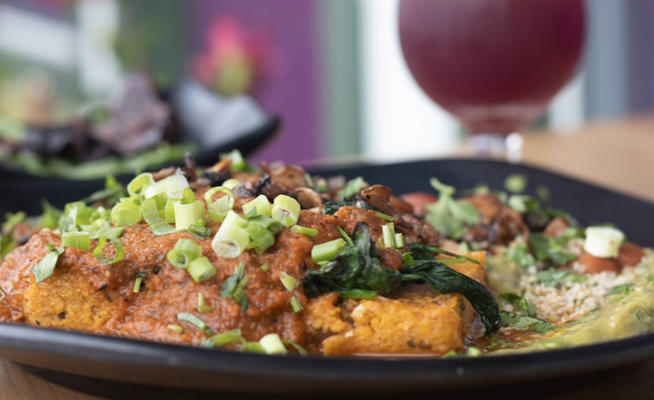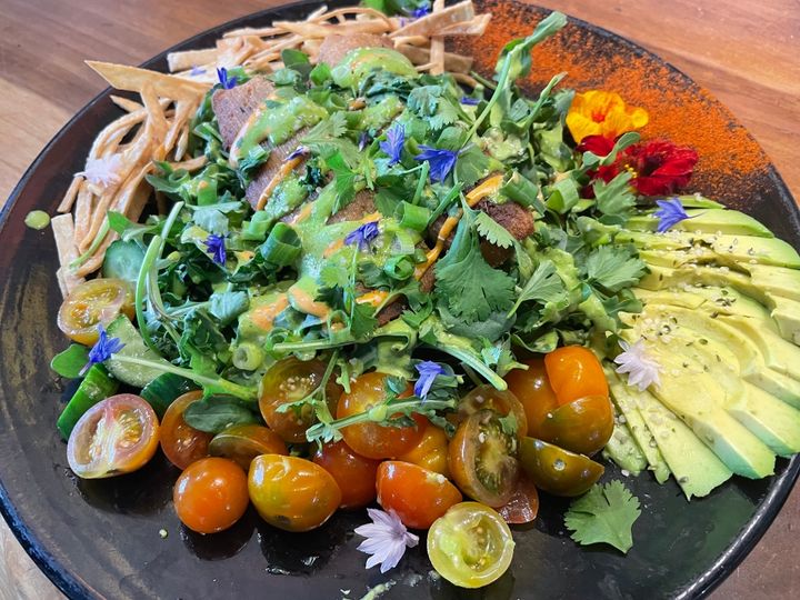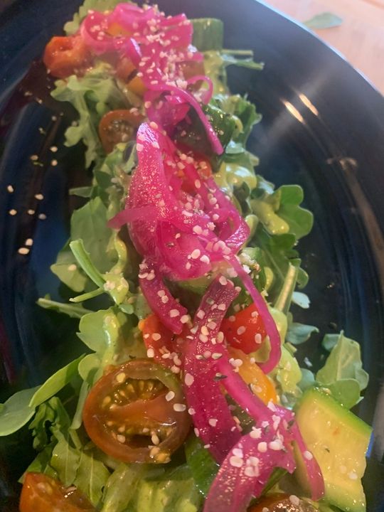 -V GF- Arugula, pickled red onions, cherry tomatoes, cucumbers with a creamy cilantro dressing. With two fried tamales, avocado, green herbs, and soft hemp seeds