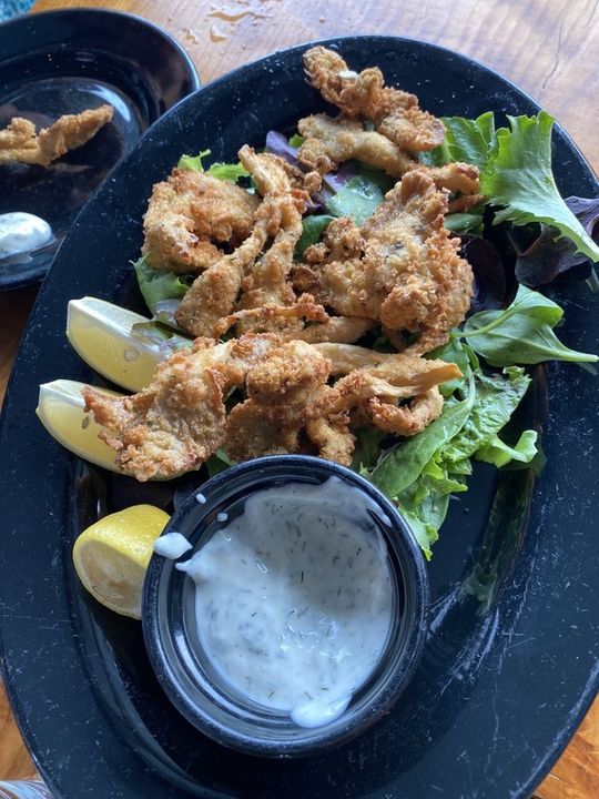 - V, GF - Breaded baby blue oyster mushrooms with vegan garlic aioli and fresh lemon.