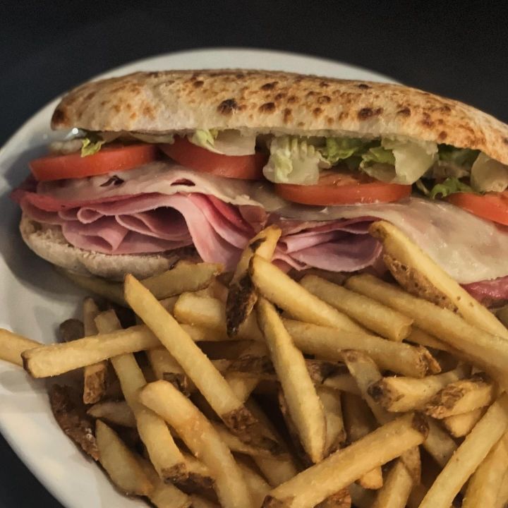 Wood Fired sandwich with ham, salami, prosciutto, mozzarella, lettuce, tomato, mayo. Served with fries