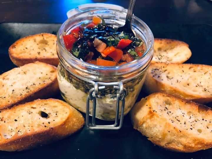 Layered whipped ricotta, pesto, tomatoes, roasted red peppers, basil, Modena balsamic, toast points