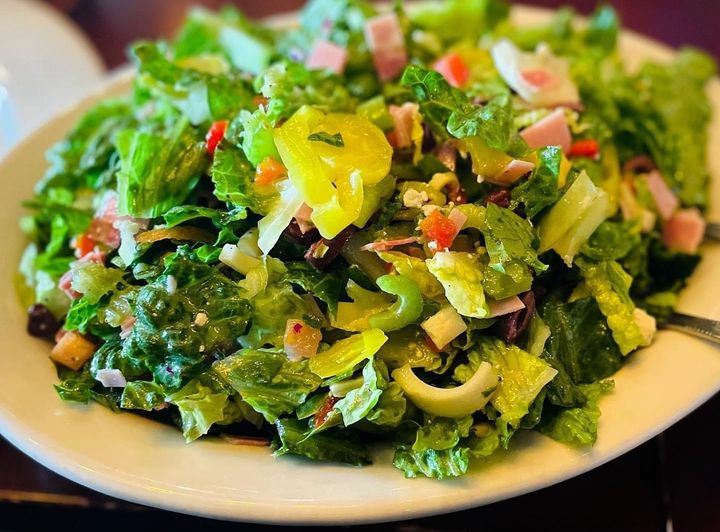 Romaine, ham, salami, hearts of palm, roasted red peppers, tomatoes, kalamata olives, gorgonzola, celery, pepperoncini