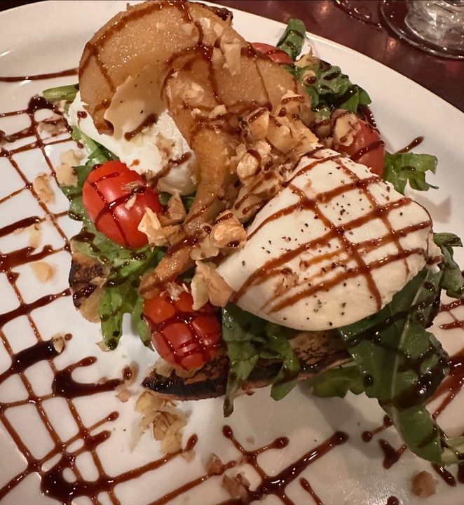 Crispy ciabatta with balsamic pears, tomatoes, candied walnuts, creamy burrata arugula, and lemon zest