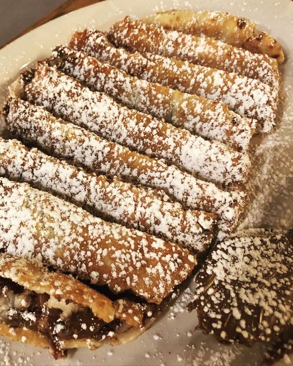 20 homemade ricotta filing stuffed in a canola shell, dusted w/ pistachio nuts & confectioners sugar