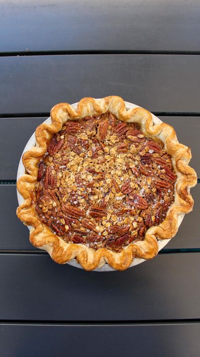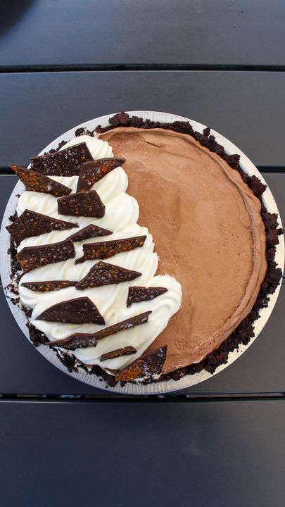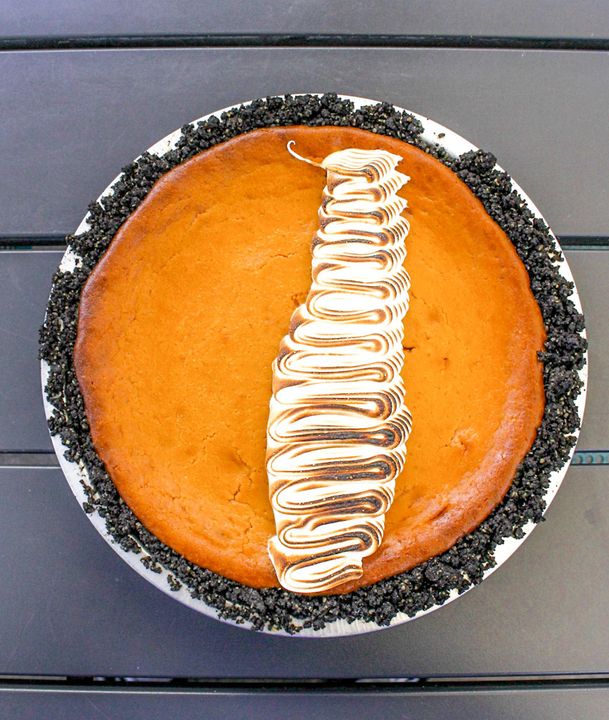 a fun twist on a classic sweet potato pie. black sesame chocolate wafer crust with a fluffy sweet potato pie filling