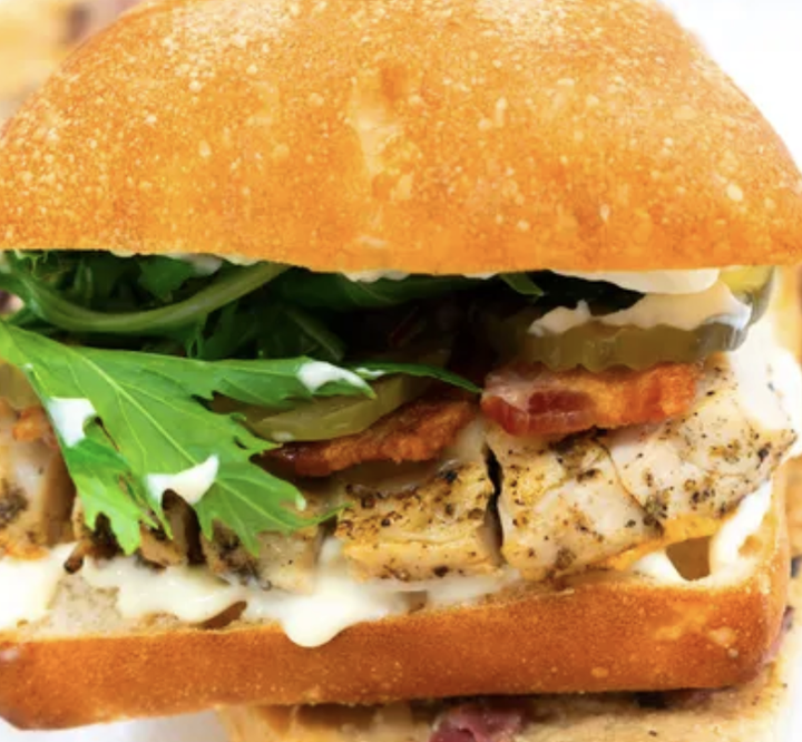 Ciabatta bread, eppercorn aioli, chicken breast, bacon, havarti cheese, tomatoes, pickles, sprin mix.