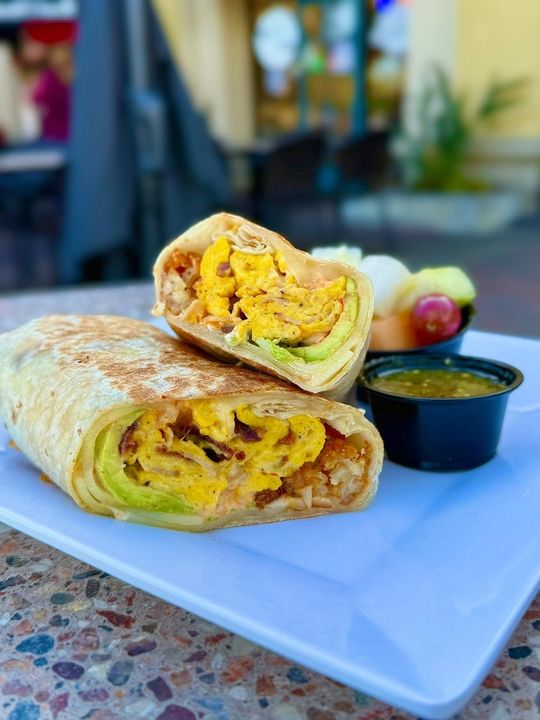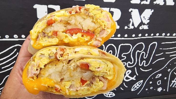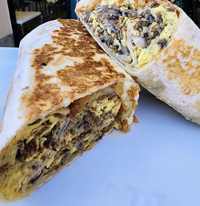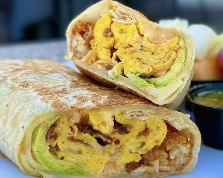 Eggs, bacon, yellow cheddar cheese, jalapeños, avocado, chipotle sauce, hash-brown, and a dash of maple syrup, wrapped in a flour tortilla.