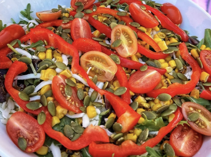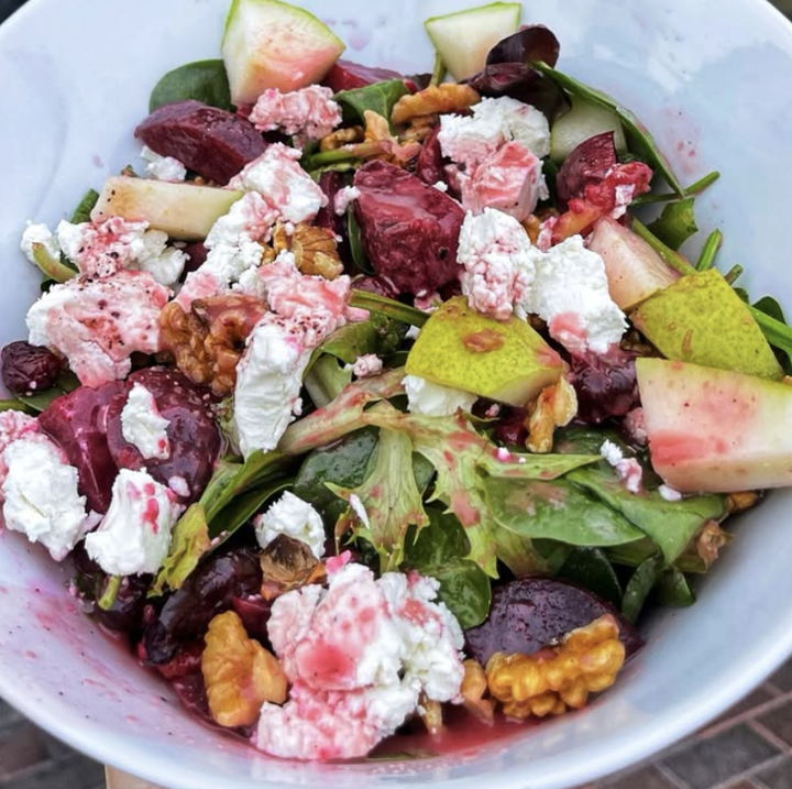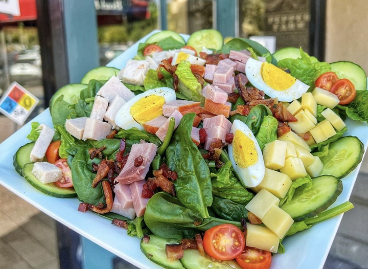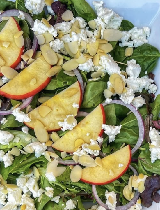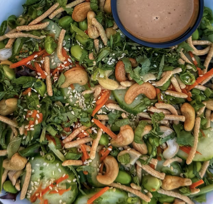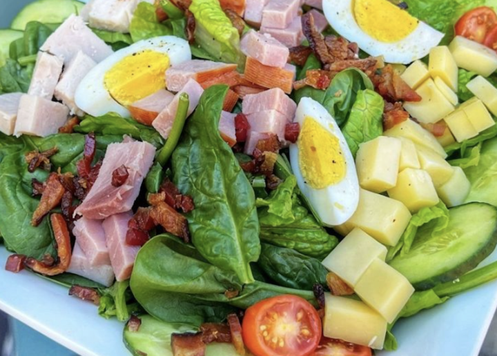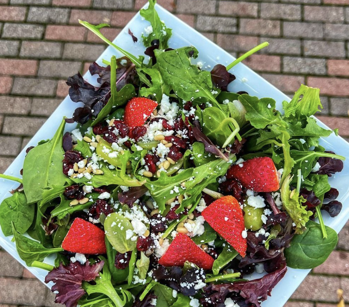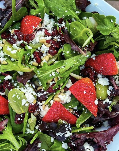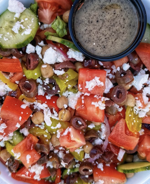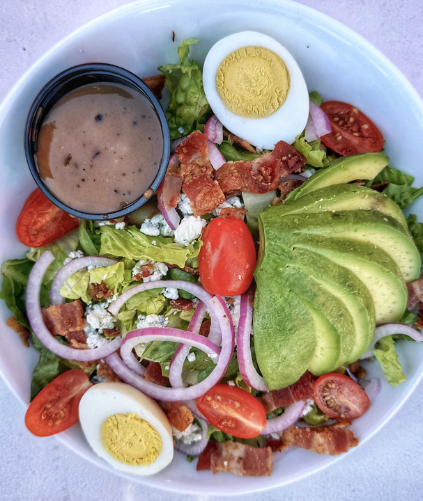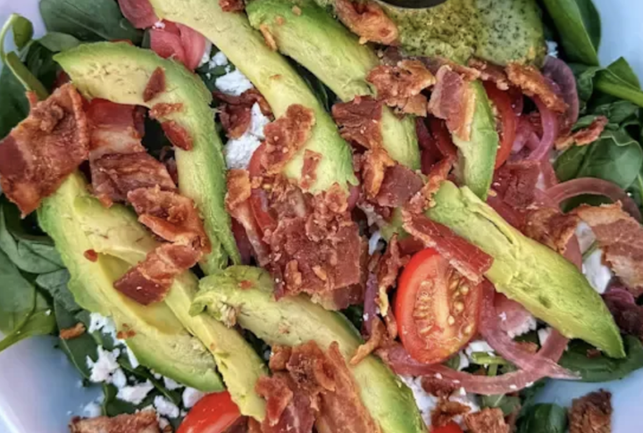 Baby spinach, arugula, pickled red onions, tomatoes, feta cheese, avocado, bacon, cilantro lime vinaigrette dressing on the side.