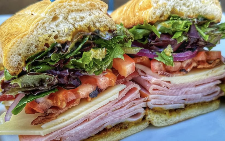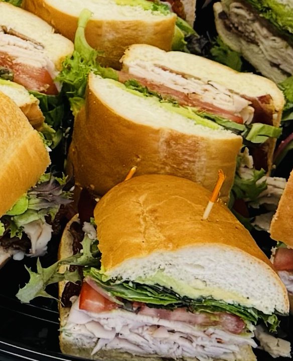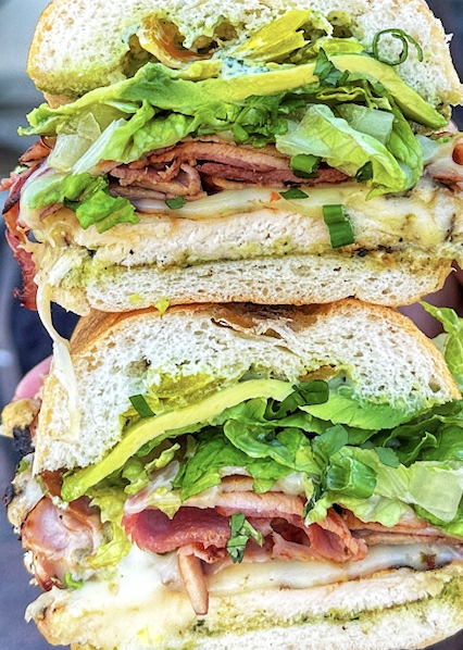 Each sandwich includes antibiotic-free, oven-roasted sliced turkey breast, crispy thick-cut bacon, freshly sliced avocado, juicy tomatoes, and organic baby spring mix. Topped with our signature house-made peppercorn aioli, all nestled in a soft hoagie roll.
