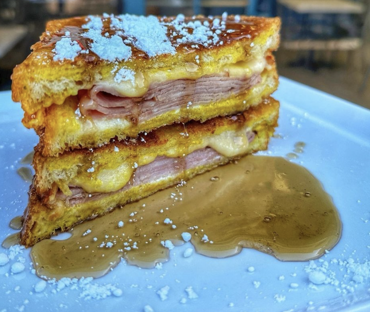 Savory grilled smoked ham, havarti cheese, mustard, mayo, on egg batter-dipped, white bread, pan fried, garnished with powdered sugar and a side of maple syrup.