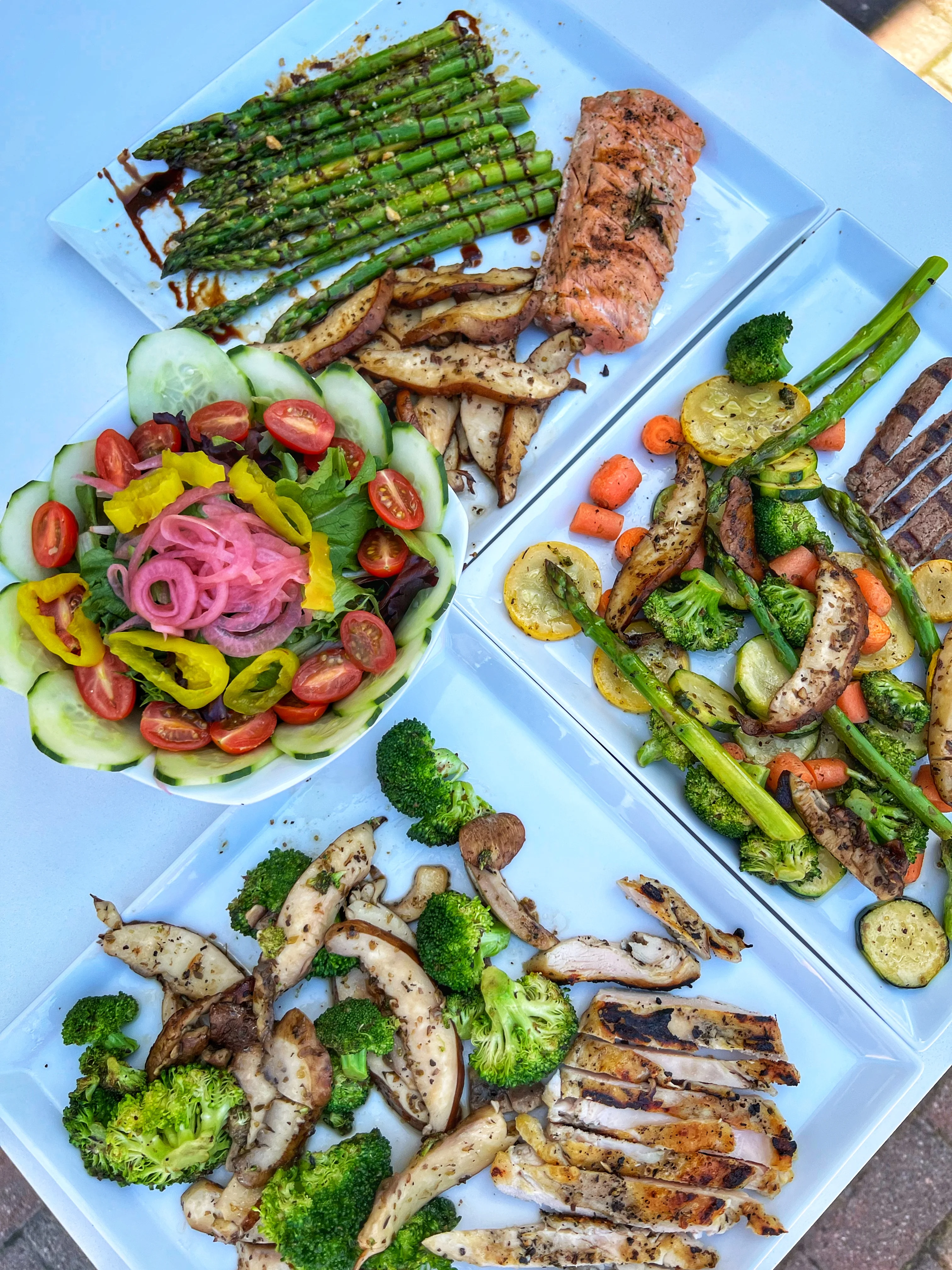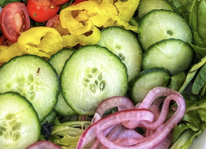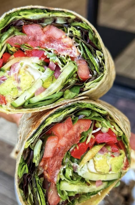 Flour tortilla, garlic aioli, cucumbers, roma tomatoes, pickled red onions, red bell peppers, avocado, sprouts, spring mix.