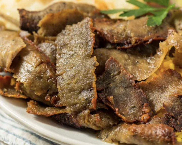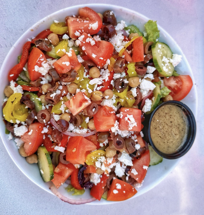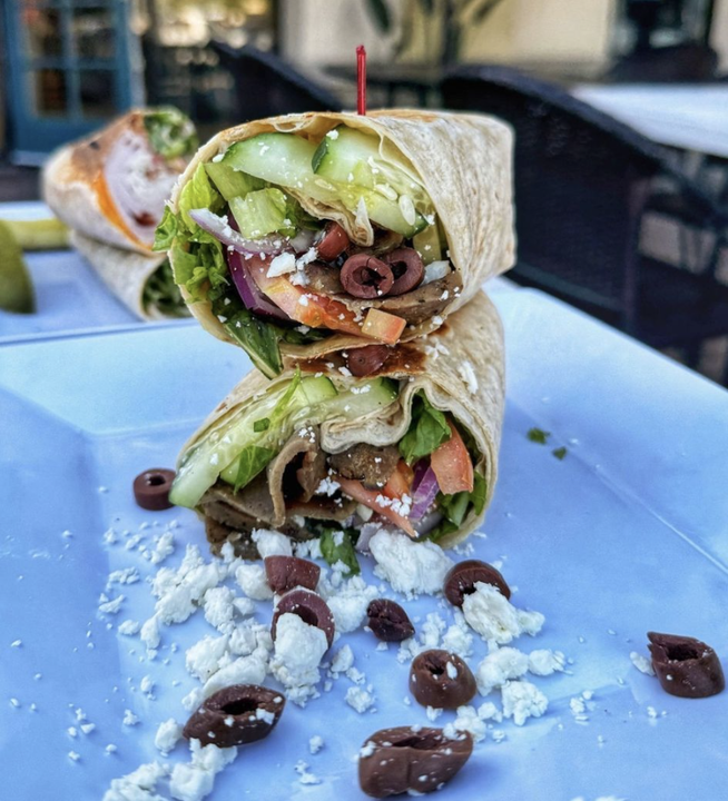 Flame broiled hand-carved Gyro with our house made tzatziki sauce, roma tomatoes, thinly sliced red onion, sliced cucumbers, feta cheese, kalamata olives, romaine lettuce in a flower tortilla.