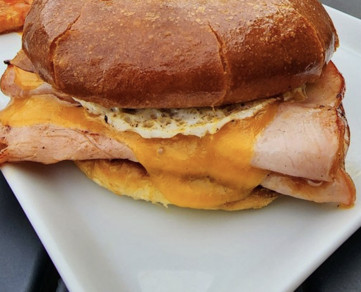 Savory grilled smoked sliced ham, fluffy scrambled eggs, melted American yellow cheddar cheese on a buttery brioche bun.