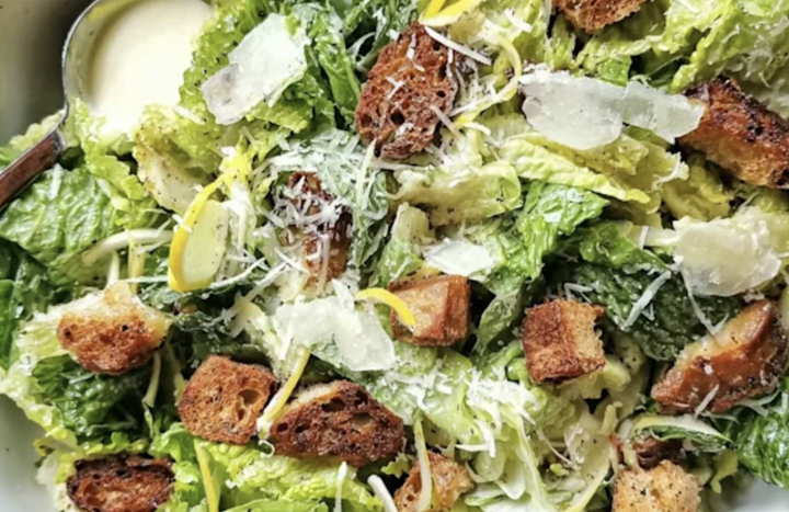 Flour tortilla, Caesar dressing, chicken breast, bacon, tomatoes, romaine lettuce, parmesan cheese, crushed croutons.