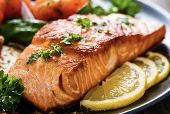 Grilled Wild-Caught Salmon, arugula, thinly sliced organic cucumbers, garlic cilantro dressing on a Brioche Bun