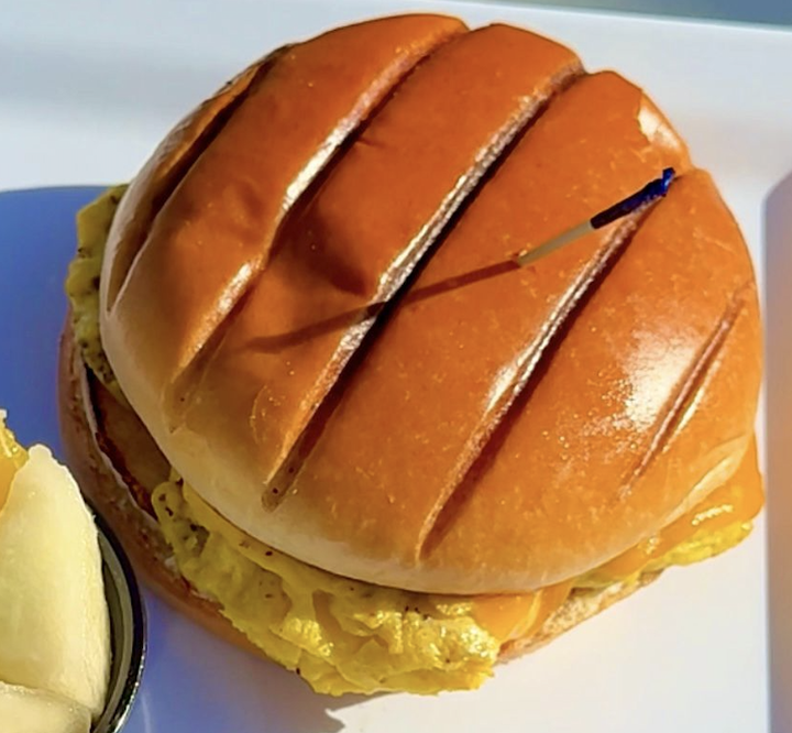 Enjoy a classic fluffy scrambled eggs and melted American yellow cheddar cheese, served on a buttery brioche bun.