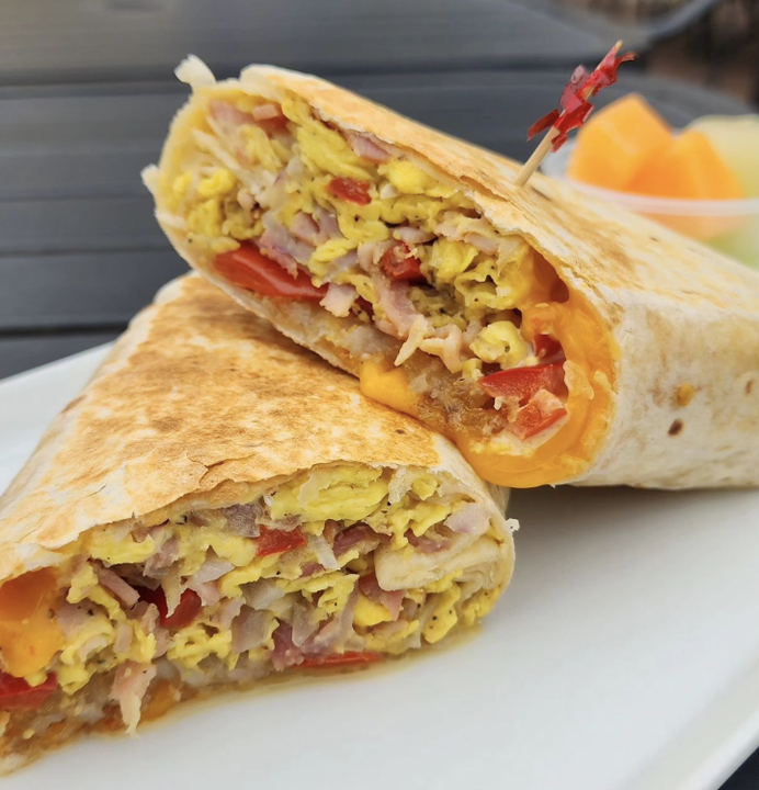 Relish a hearty wrap featuring fluffy scrambled eggs, savory grilled smoked ham, caramelized red onions, vibrant red bell peppers, melted yellow cheddar cheese, crispy hash browns, house-made garlic aioli, and a touch of maple syrup, all wrapped in a warm flour tortilla.