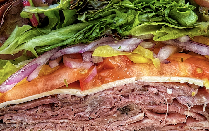 Sliced roast beef, creamy Havarti cheese, juicy tomatoes, crisp red onions, tangy banana peppers, and organic baby spring mix. Drizzled with our signature house-made peppercorn aioli, all in a freshly baked, soft hoagie roll.
