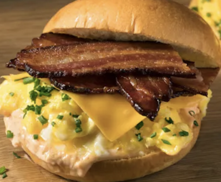 Delicious bacon and egg sandwich, thick-cut crispy bacon, fluffy scrambled eggs, melted pepper jack cheese, and fresh organic spring mix, all served on a freshly baked brioche bun.