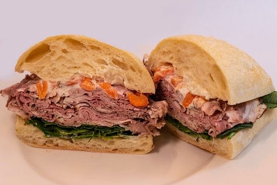 Scrambled or Fried Egg, Tender Shaved Beef and your choice of Cheese served on a Toasted Ciabatta Roll. We do not cut biscuit sandwiches or any items with over easy eggs.