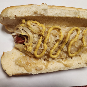 Quarter Pound All Beef Hot Dog "Kosher Style" Topped with spicy deli mustard, sauerkraut and fried onions.