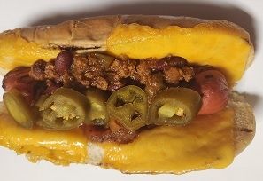 Quarter Pound All Beef Hot Dog "Kosher Style" Topped with beef chili, cheddar cheese & sliced jalapeno.