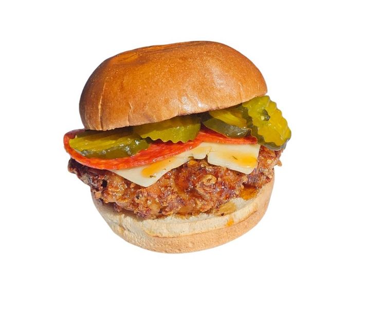 Chicken filet breaded with My Dad’s French Onion Chips®, fried crispy, on Brioche bun with sliced pickles, Pepperjack cheese, pepperoni & hot honey Includes a small bag of My Dad’s Chips®