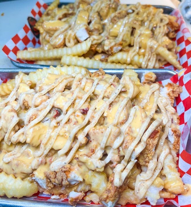 cajun fries topped with chopped tenders, melted cheese, CHI sauce, & spicy mayo