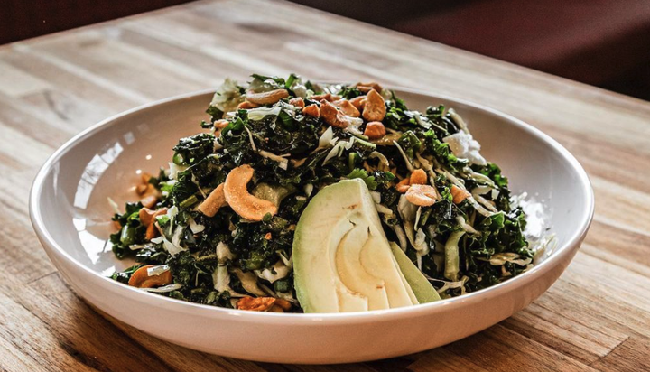 Kale, avocado, cabbage, cashew, cilantro, mint, green onion, sesame soy vinaigrette