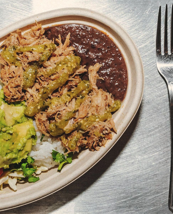 Shredded pork, avocado, rice, beans, cebolita slaw, salsa verde, pico, cilantro