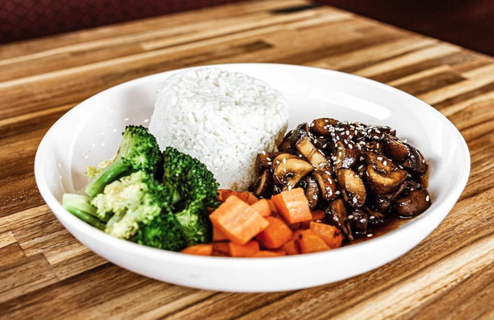 Bulgogi style mushrooms, rice, carrots, broccoli, sesame seeds, green onion.