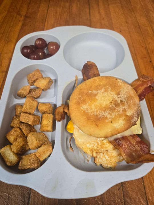 Eggs, tomato, spinach and onions scrambled together. Side of turkey bacon, home fries, 1 biscuit & small fruit cup