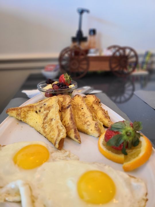 2 eggs any style, 2 slices of Challah French toast hand-dipped in our cinnamon egg batter & fresh fruit cup