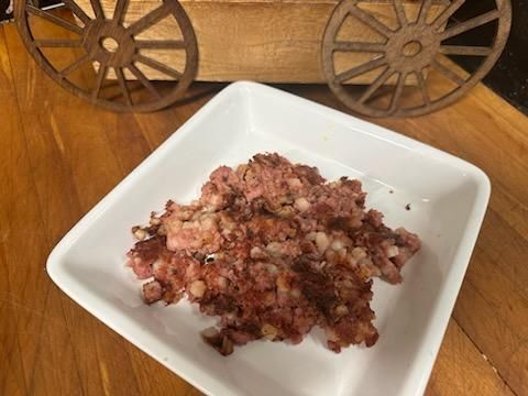 2 eggs any style, pan-fried corned beef hash. Home-fries & choice of bread