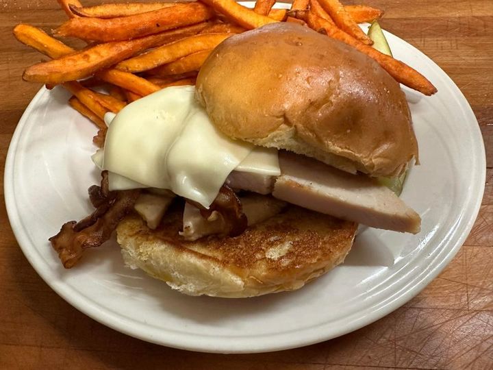 Slow roasted turkey sliced with crispy bacon, choice of grilled bread & choice of cheese