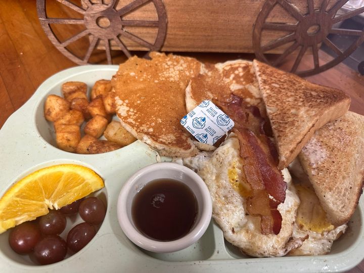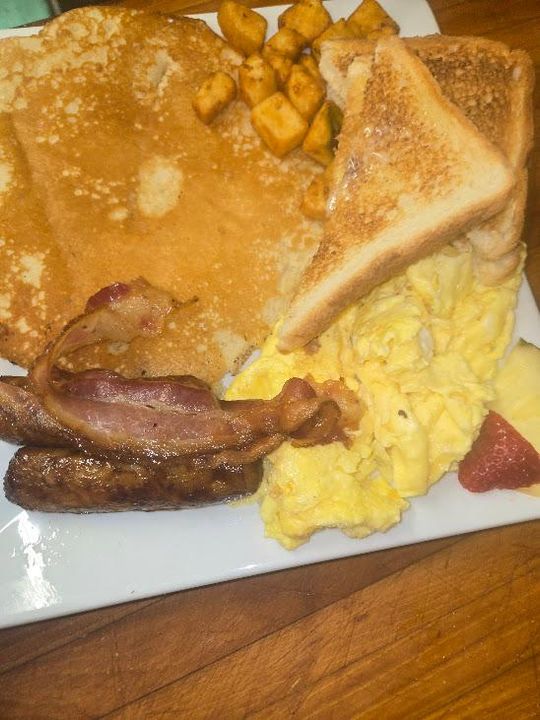 3 eggs any style, 1 pancake, bacon & sausage. Home fries & choice of bread